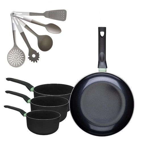 - DESCRIPTION : Ensemble complet Fackelmann Brandao avec poêle et casseroles en aluminium recyclé, et cinq ustensiles ergonomiques pour une cuisine efficace.