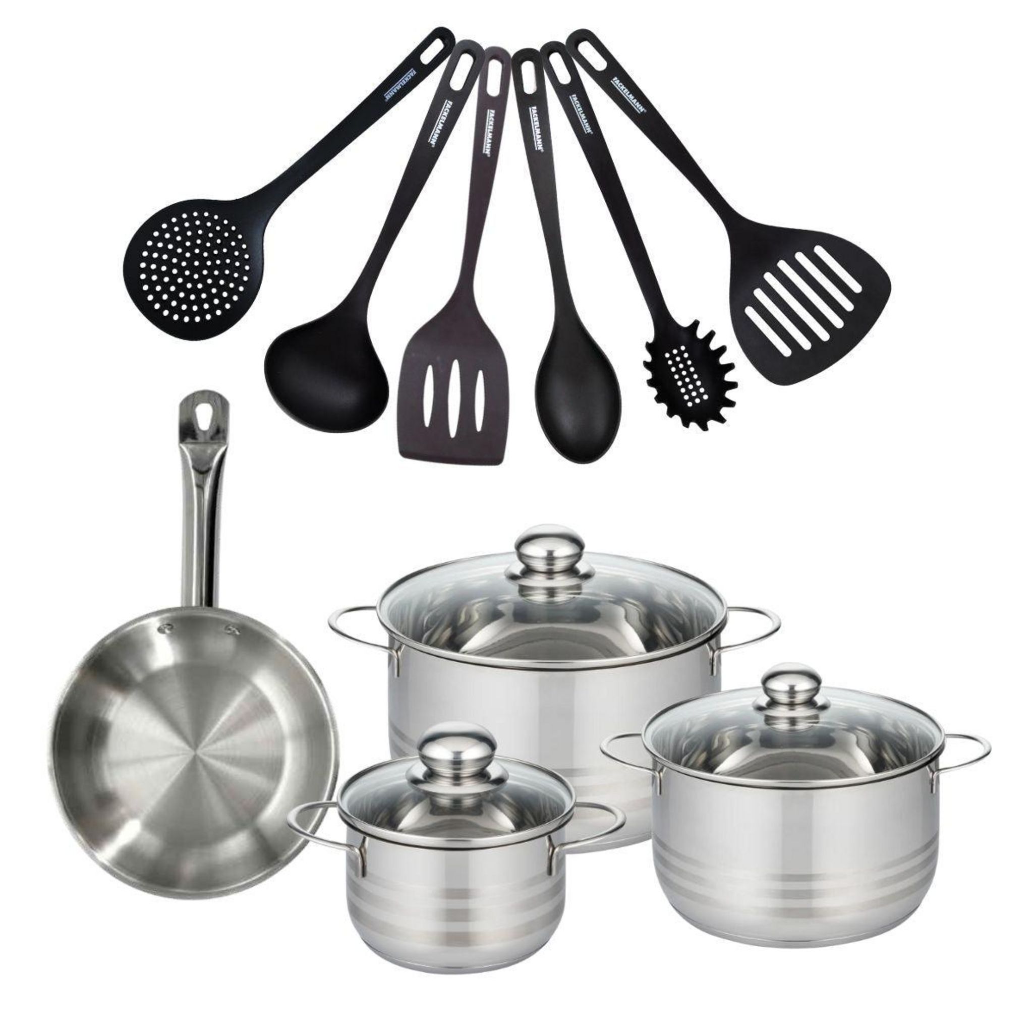 Set 1 poêle 20 cm en inox, 3 faitouts inox 16, 20 et 24 cm et 6 ustensiles RPET Fackelmann Eterna