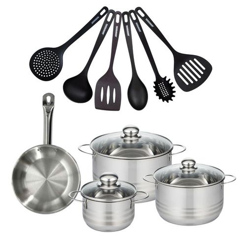 - DESCRIPTION: Ensemble de cuisine Fackelmann Eterna incluant une poêle à frire en inox 18/8 de 20 cm, 3 faitouts de 16, 20 et 24 cm, et 6 ustensiles en RPET noir, parfaits pour diverses préparations culinaires