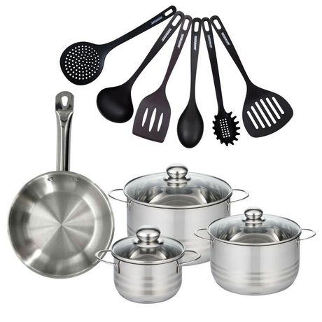 - DESCRIPTION: Set de cuisson Fackelmann Eterna avec une poêle à frire en inox 18/8 de 24 cm, 3 faitouts de 16, 20 et 24 cm, et 6 ustensiles en RPET noir
