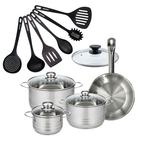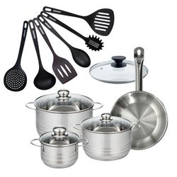 Set 1 poêle 24 cm en inox et 1 couvercle verre, 3 faitouts inox 16, 20 et 24 cm et 6 ustensiles RPET Fackelmann Eterna