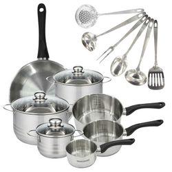 Set 1 poêle 28 cm 3 casseroles 12 16 20 cm, 3 faitouts 16, 20 et 24 cm en inox et 6 ustensiles inox Fackelmann Geneva