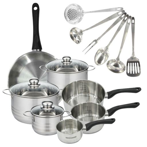 - DESCRIPTION: Batterie de cuisine sans PFAS Fackelmann avec 1 poêle de 28 cm, trois casseroles (12, 16, 20 cm) en acier inox 18/8, trois faitouts (16, 20, 24 cm) et 6 ustensiles inox