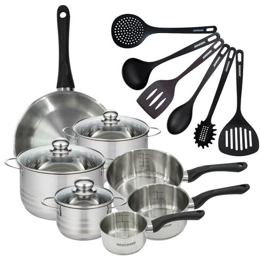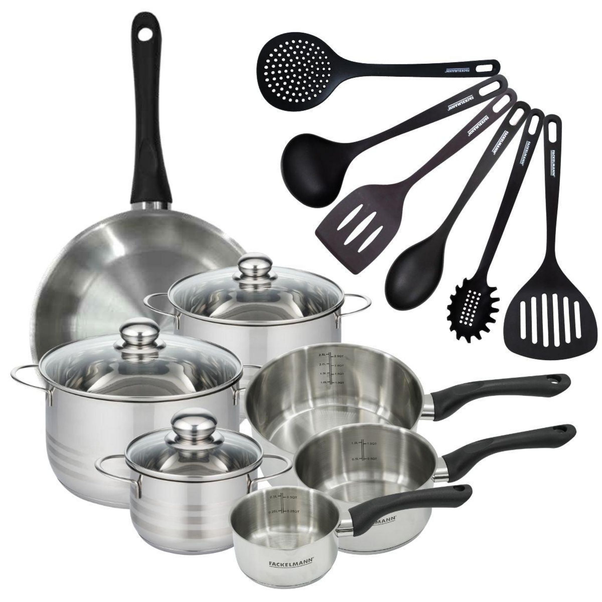 Set 1 poêle 28 cm 3 casseroles 12 16 20 cm, 3 faitouts 16, 20 et 24 cm en inox et 6 ustensiles RPET Fackelmann Geneva