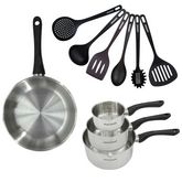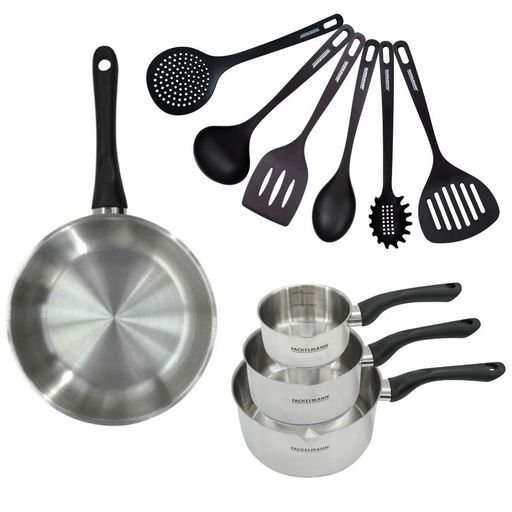 Set 1 poêle 28 cm 3 casseroles 12 16 et 20 cm en inox et 6 ustensiles Fackelmann Geneva