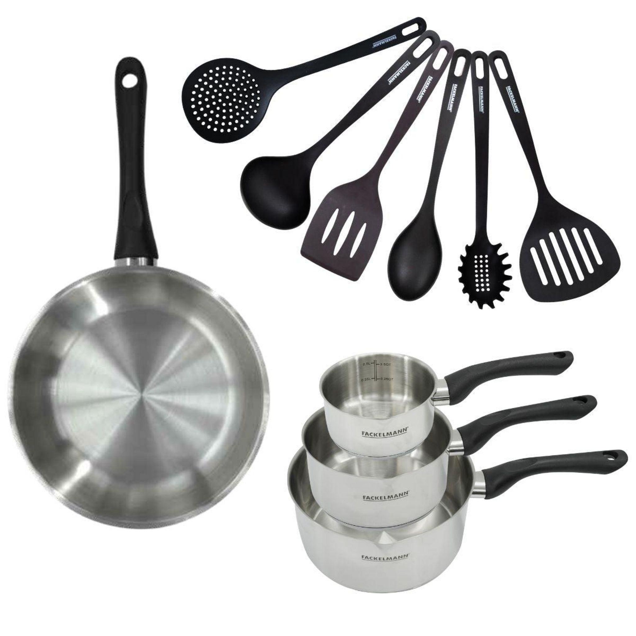 - DESCRIPTION: Set de cuisine Fackelmann Geneva comprenant une poêle de 28 cm et trois casseroles de 12, 16 et 20 cm, et 6 ustensiles de cuisine et de service pour cuisiner tous types de plats