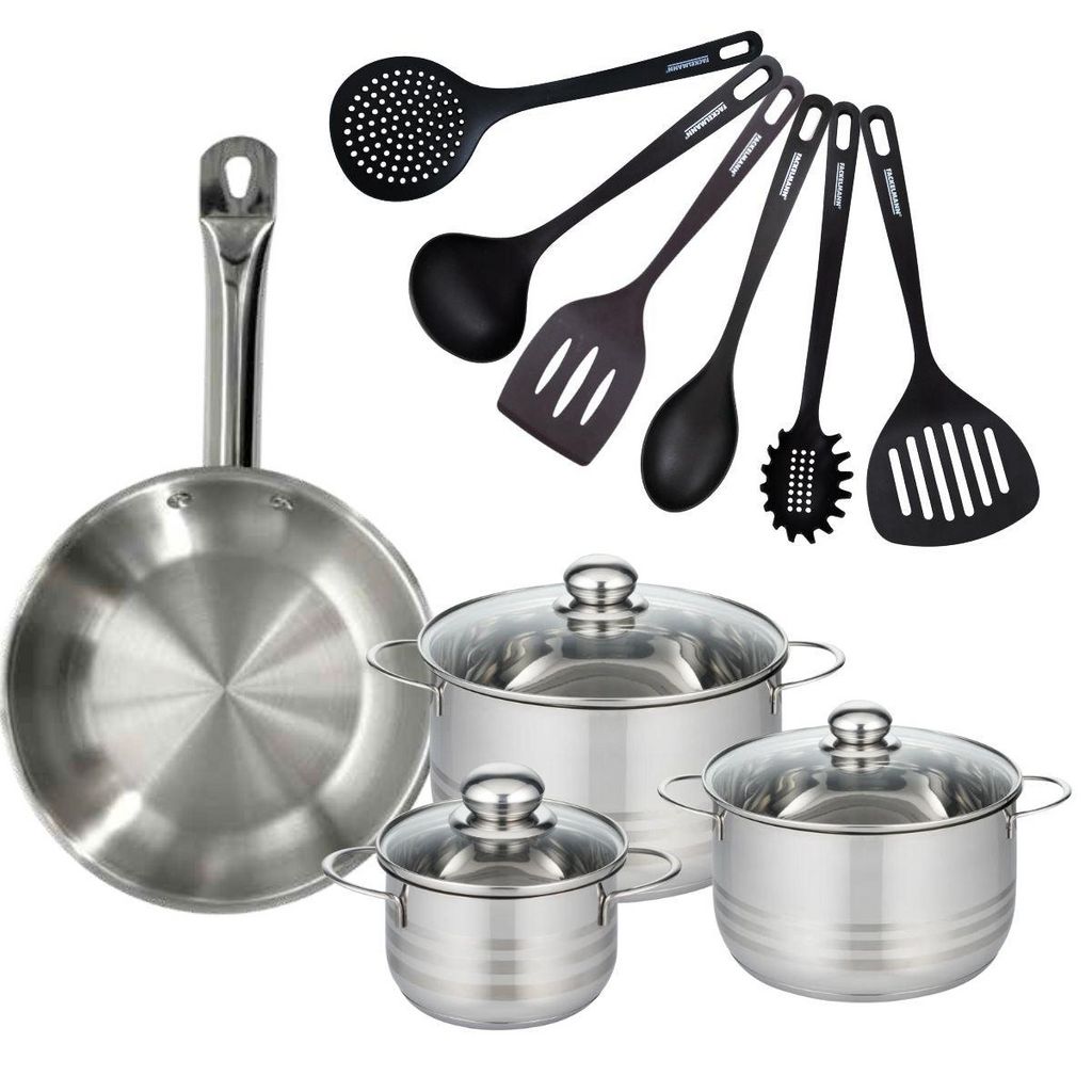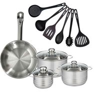 Set 1 poêle 28 cm en inox, 3 faitouts inox 16, 20 et 24 cm et 6 ustensiles RPET Fackelmann Eterna