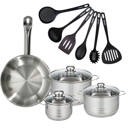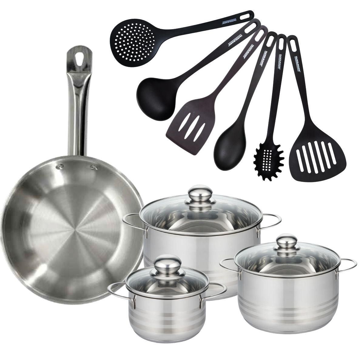 - DESCRIPTION: Set de cuisson Fackelmann Eterna avec une poêle à frire en inox 18/8 de 28 cm, 3 faitouts de 16, 20 et 24 cm, et 6 ustensiles de cuisine et de service