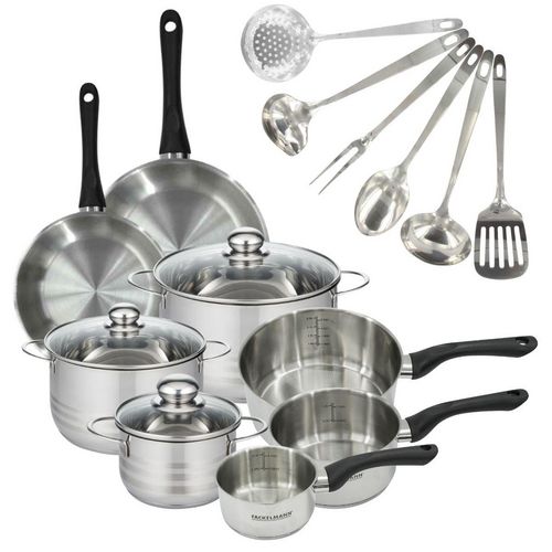 - DESCRIPTION: Batterie de cuisine sans PFAS Fackelmann de 2 poêles de 20 et 24 cm, 3 casseroles (12, 16, 20 cm) en acier inox 18/8, 3 faitouts (16, 20, 24 cm) et 6 ustensiles inox