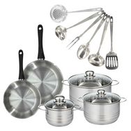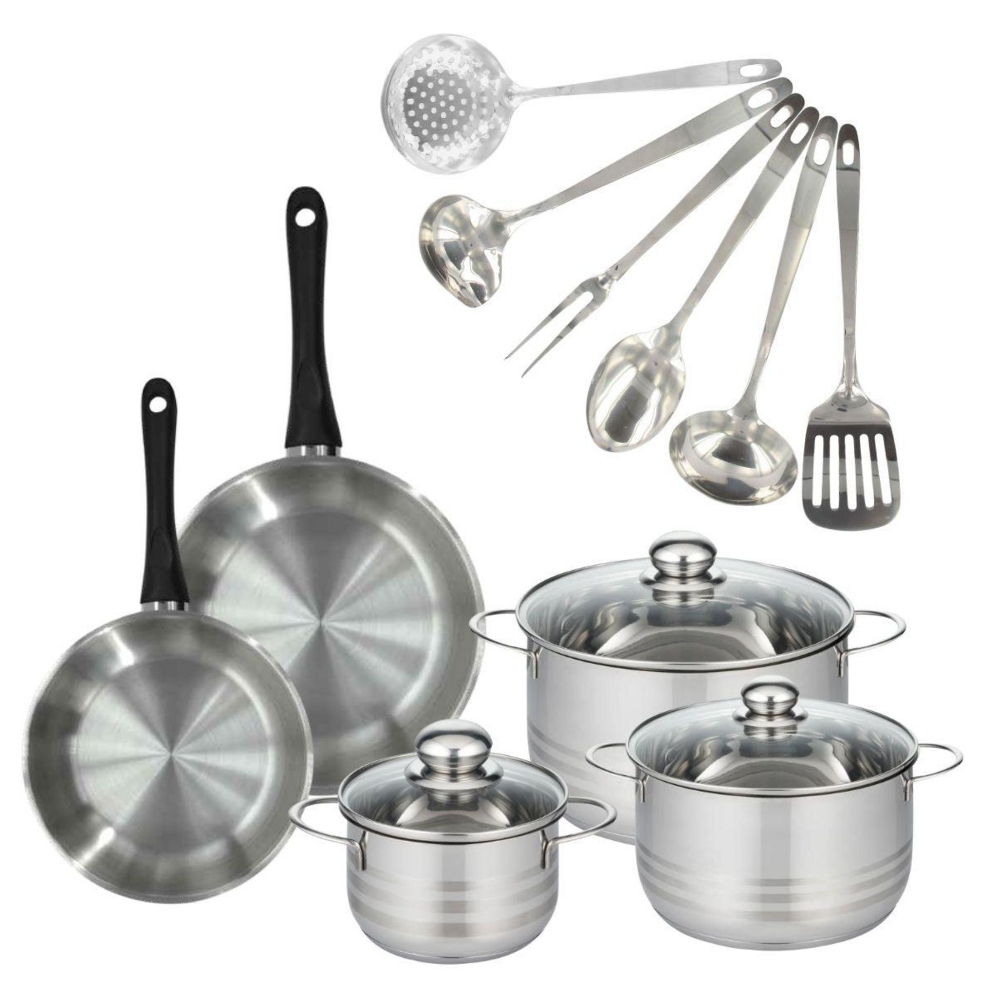 Set 2 poêles 20 24 cm, 3 faitouts 16, 20 et 24 cm en inox et 6 ustensiles inox Fackelmann Geneva