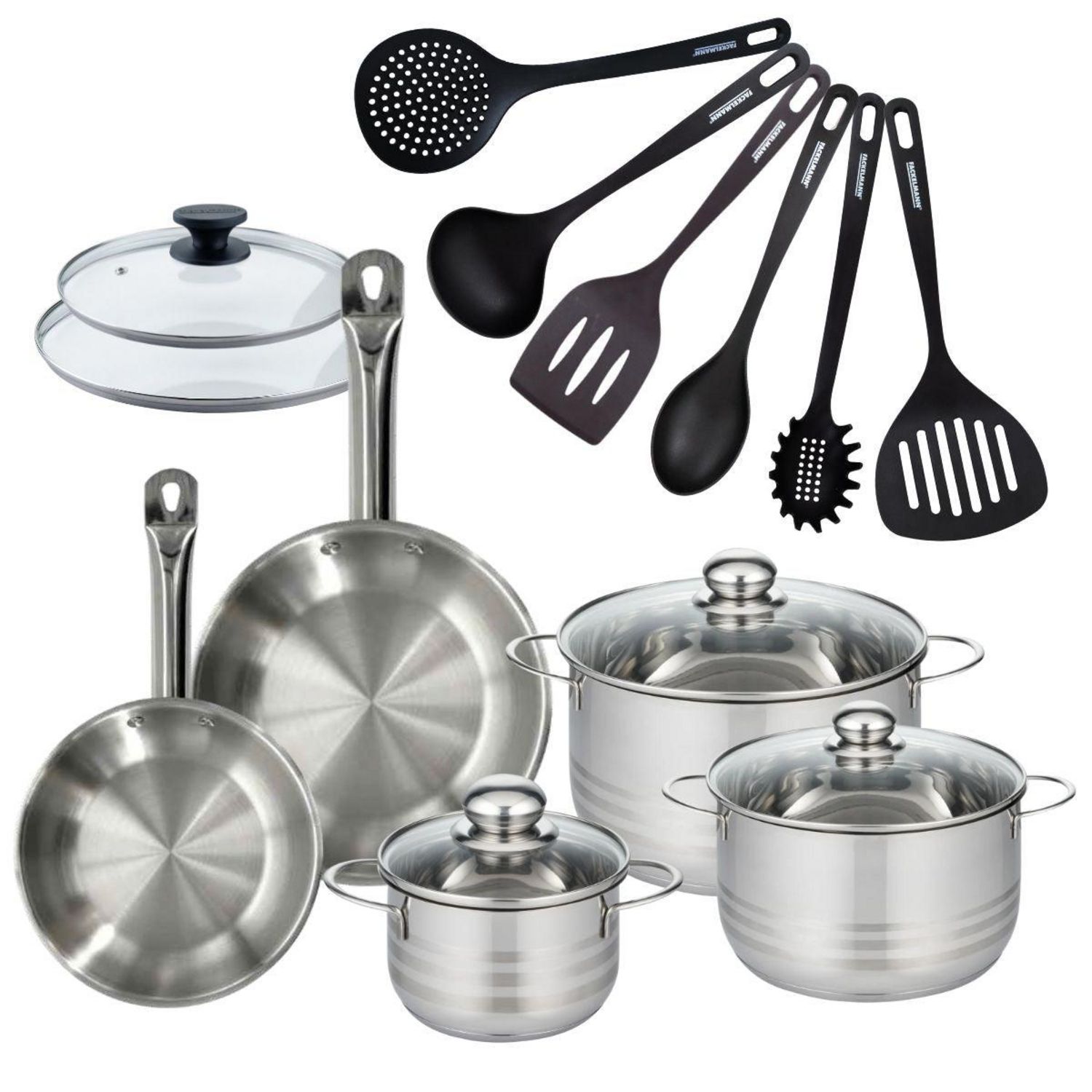- DESCRIPTION: Batterie de cuisine Fackelmann Eterna de 2 poêles à frire en inox 18/8 20 et 24 cm et leurs couvercles, 3 faitouts de 16, 20 et 24 cm et 6 ustensiles