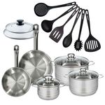 Set 2 poêles 20 24 cm en inox, 2 couvercles verre, 3 faitouts inox 16, 20 et 24 cm et 6 ustensiles RPET Fackelmann Eterna