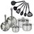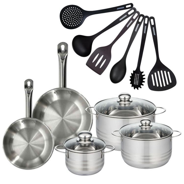 Set 2 poêles 20 24 cm en inox, 3 faitouts inox 16, 20 et 24 cm et 6 ustensiles RPET Fackelmann Eterna