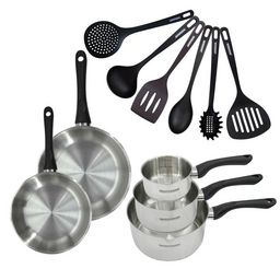 Set 2 poêles 20 et 24 cm 3 casseroles 12 16 et 20 cm en inox et 6 ustensiles Fackelmann Geneva