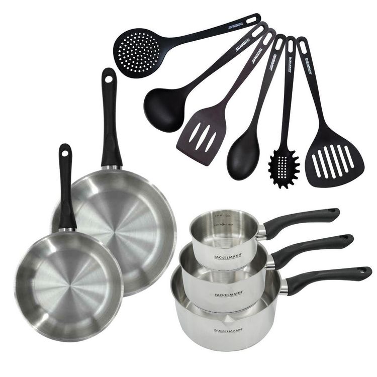- DESCRIPTION: Set Fackelmann Geneva de 2 poêles de 20 et 24 cm, 3 casseroles de 12, 16 et 20 cm, et 6 ustensiles de cuisine et de service , idéal pour 1 à 4 personnes