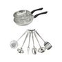 Ajoutez à cela 6 ustensiles de cuisson et de service robustes, en acier inoxydable : louche, louche ovale, cuillère de service, écumoire, fourchette à viande, pelle de service robustes. Lavage à la main recommandé.