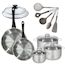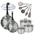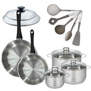 Set 2 poêles 24 28 cm avec couvercle, 3 faitouts 16, 20 et 24 cm en inox et 5 ustensiles Fackelmann Geneva