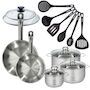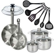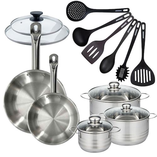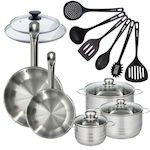 Set 2 poêles 24 28 cm en inox, 2 couvercles verre, 3 faitouts inox 16, 20 et 24 cm et 6 ustensiles RPET Fackelmann Eterna