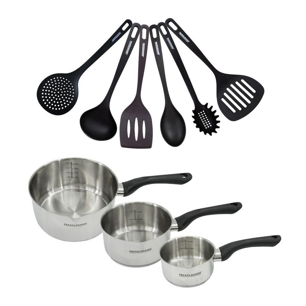 Set 3 casseroles 12 16 et 20 cm en inox et 6 ustensiles Fackelmann Geneva