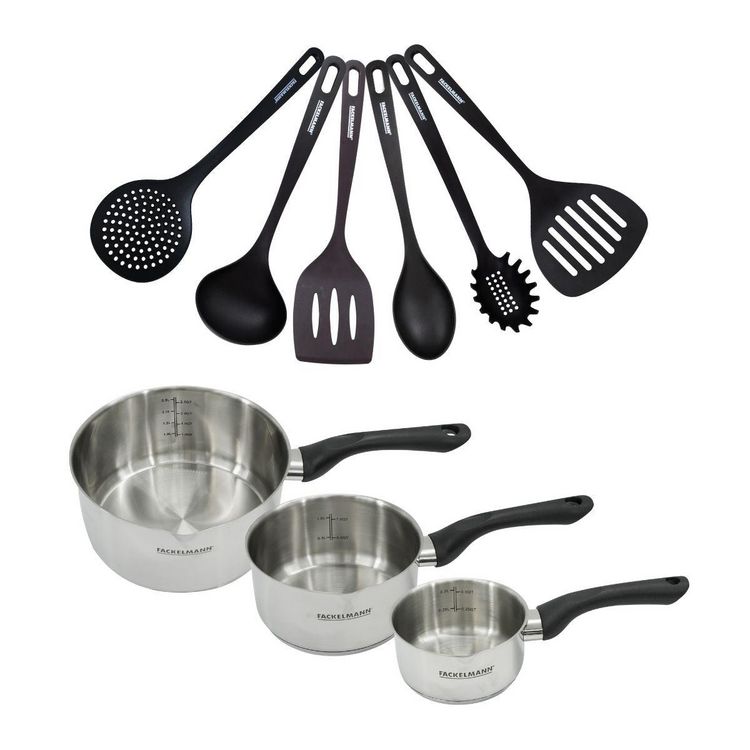- DESCRIPTION: Batterie de casseroles de 12, 16 et 20 cm Fackelmann Geneva en inox 18/8, complétée par 6 ustensiles en RPET pour cuisiner et servir