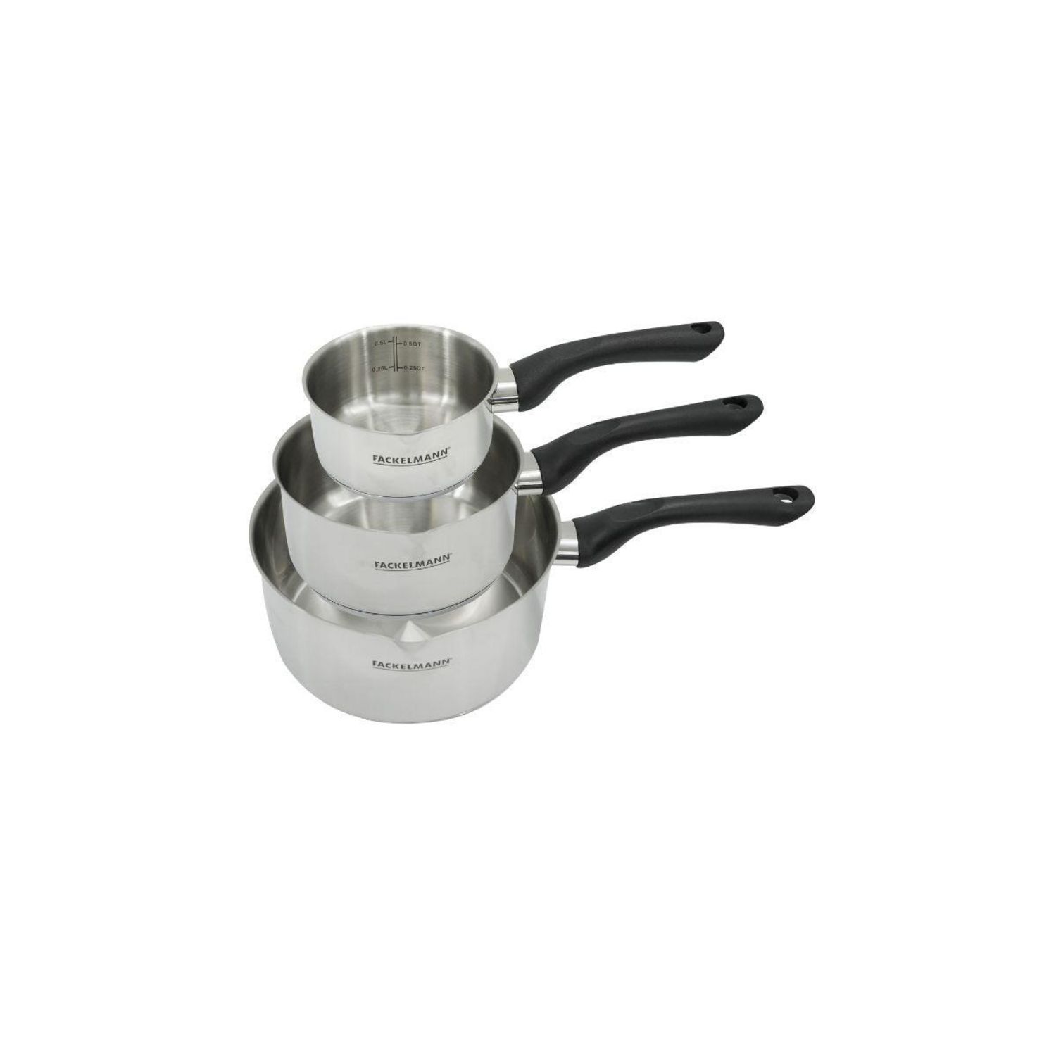 - DESCRIPTION: Set de casseroles Fackelmann Geneva en inox 18/8 de 12 cm, 16 cm et 20 cm, parfaites pour sauces et plats variés pour 1 à 4 personnes
