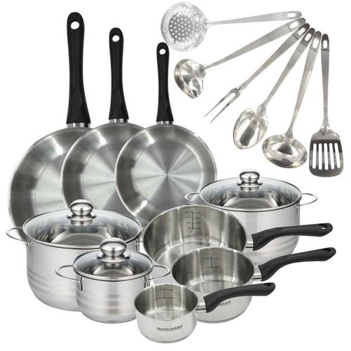 - DESCRIPTION: Batterie de cuisine sans PFAS Fackelmann de 3 poêles (20 24 28 cm), 3 casseroles (12 16 20 cm) en acier inox 18/8, 3 faitouts (16 20 24 cm) et 6 ustensiles inox