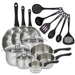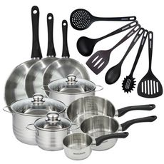 - COMPOSITION: Un set de haute qualité sans PFAS, poêle et casseroles en acier inoxydable 18/8, faitouts en inox , résistants aux rayures et à la corrosion , ustensiles en plastique recyclé