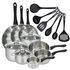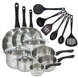 Set 3 poêles 20 24 28 cm 3 casseroles 12 16 20 cm, 3 faitouts 16, 20 et 24 cm en inox et 6 ustensiles RPET Fackelmann Geneva