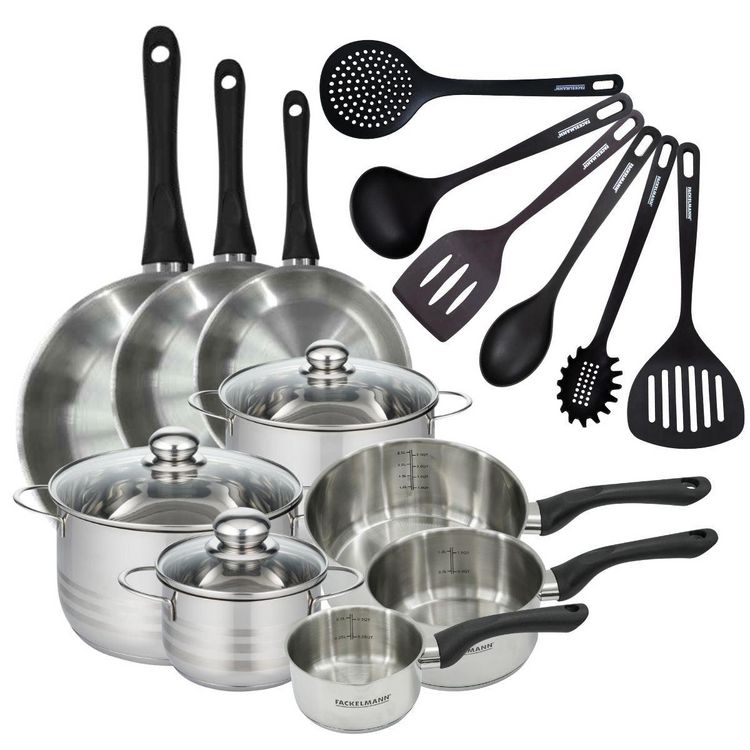 - DESCRIPTION: Batterie de cuisine sans PFAS Fackelmann de 3 poêles (20 24 28 cm), 3 casseroles (12 16 20 cm) en acier inox 18/8, 3 faitouts inox (16 20 24 cm) et 6 ustensiles RPET