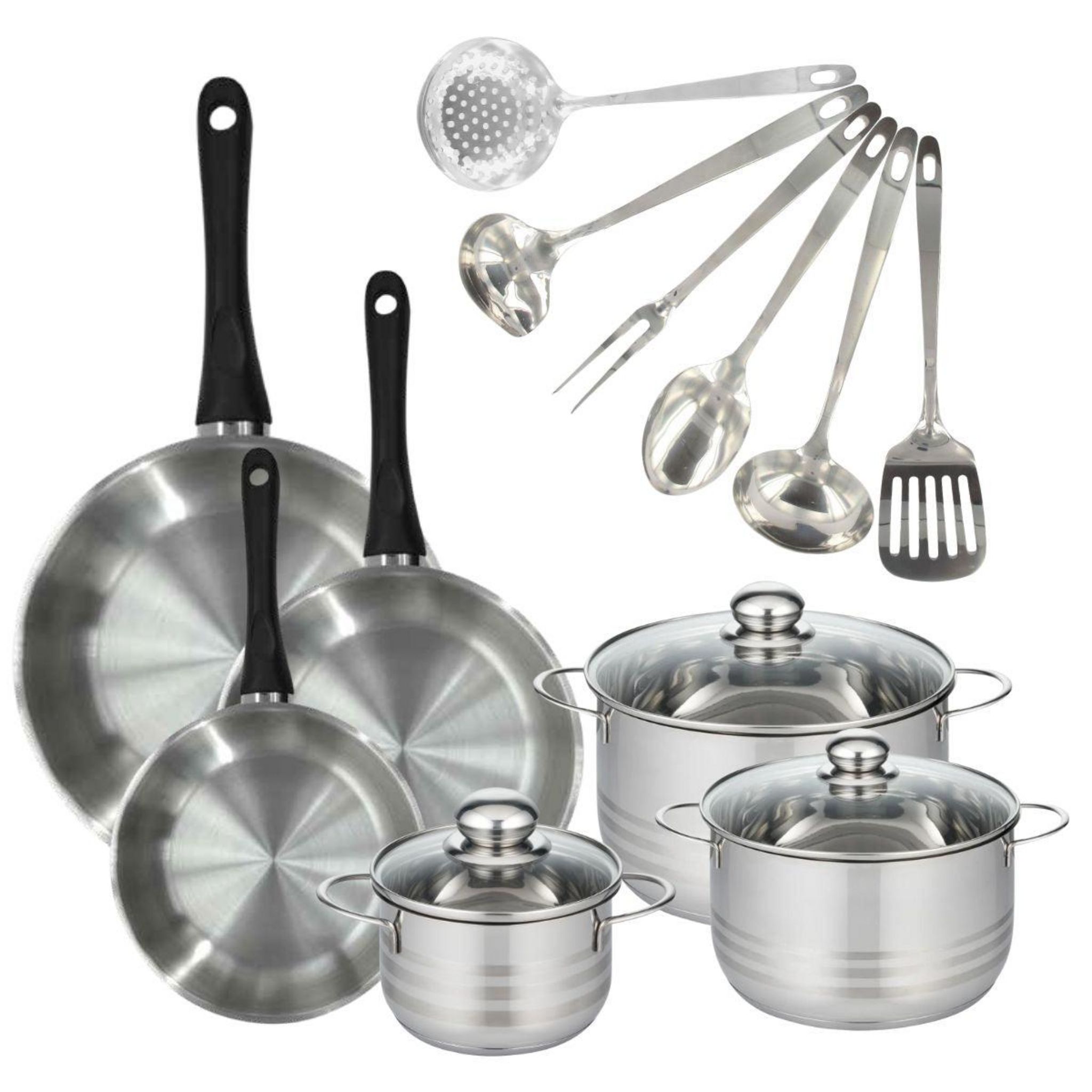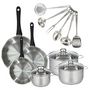 Set 3 poêles 20 24 28 cm, 3 faitouts 16, 20 et 24 cm en inox et 6 ustensiles inox Fackelmann Geneva
