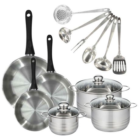 - DESCRIPTION: Set Fackelmann Geneva de 3 poêles de 20, 24 et 28 cm en inox 18/8, 3 faitouts inox de 16 cm, 20 cm et 24 cm et 6 ustensiles
