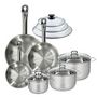Set 3 poêles 20 24 28 cm en inox et 3 couvercles verre, 3 faitouts inox 16, 20 et 24 cm Fackelmann Eterna