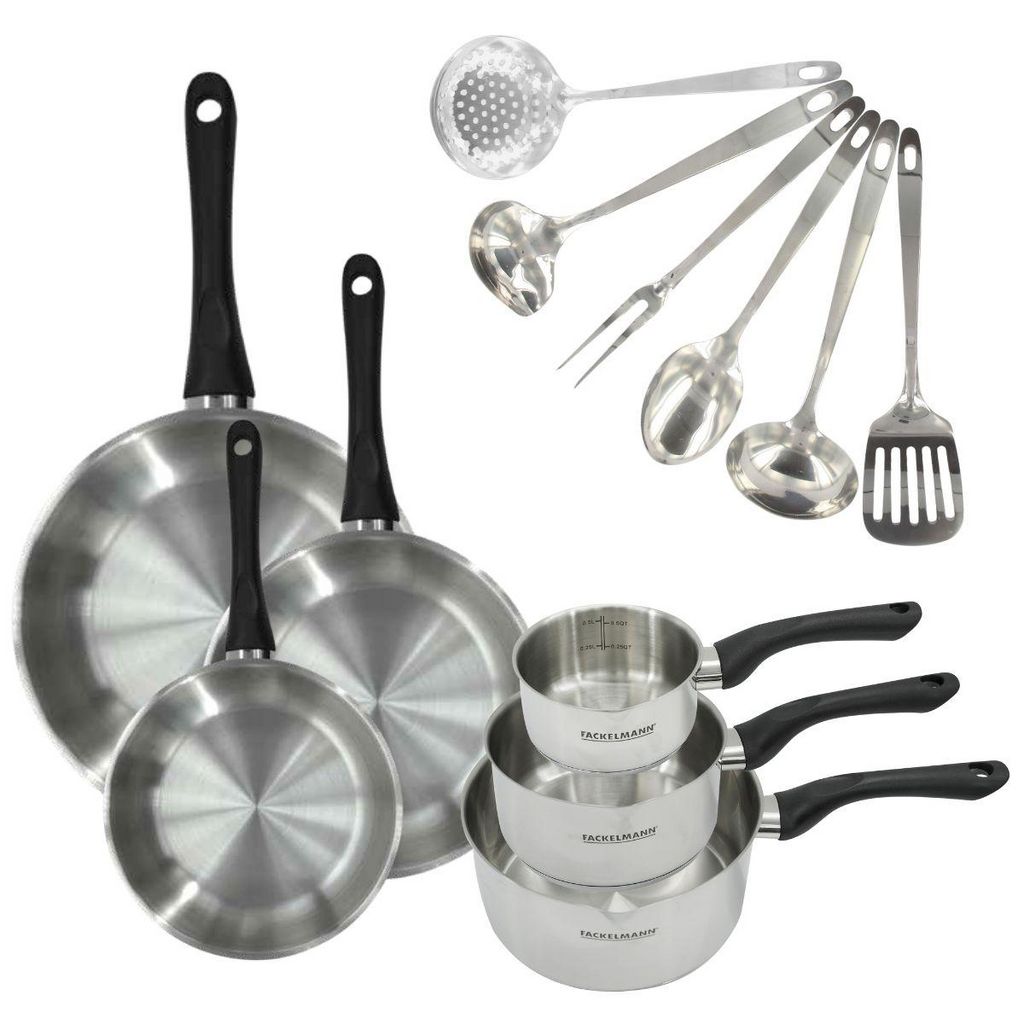 - DESCRIPTION: Set Fackelmann Geneva de 3 poêles de 20, 24 et 28 cm, 3 casseroles de 12, 16 et 20 cm, et 6 ustensiles de cuisine et de service en inox , idéal pour 1 à 5 personnes