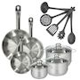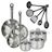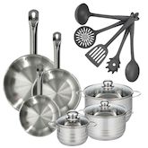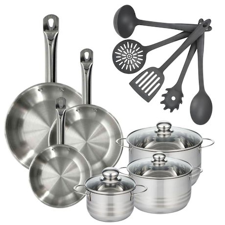 Set 3 poêles 20, 24 et 28 cm en inox, 3 faitouts inox 16, 20 et 24 cm et 5 ustensiles Fackelmann Eterna