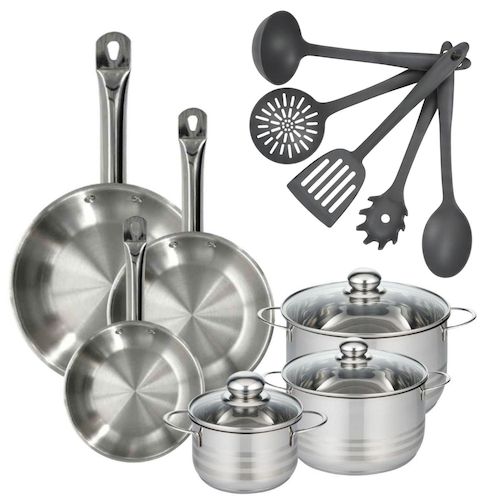 - COMPOSITION : Poêles en acier inoxydable 18/8 de haute qualité, faitouts également en inox, ustensiles en PBT léger et résistant