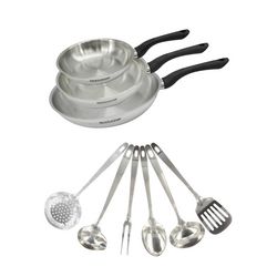 Set 3 poêles 20 24 et 28 cm en inox et 6 ustensiles inox Fackelmann Geneva