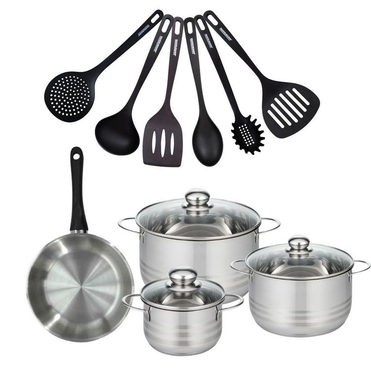 - DESCRIPTION: Set Fackelmann Geneva inox avec 1 poêle 20 cm, 3 faitouts inox de 16, 20 et 24 cm, et 6 ustensiles de cuisine en RPET noir