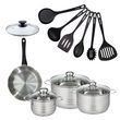 Set de 1 poêle 20 cm en inox, couvercle verre, 3 faitouts inox 16, 20 et 24 cm et 6 ustensiles RPET Fackelmann Geneva
