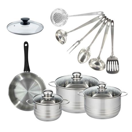 - DESCRIPTION: Set Fackelmann Geneva inox avec 1 poêle 20 cm et son couvercle, 3 faitouts inox de 16, 20 et 24 cm, et 6 ustensiles de cuisine en inox