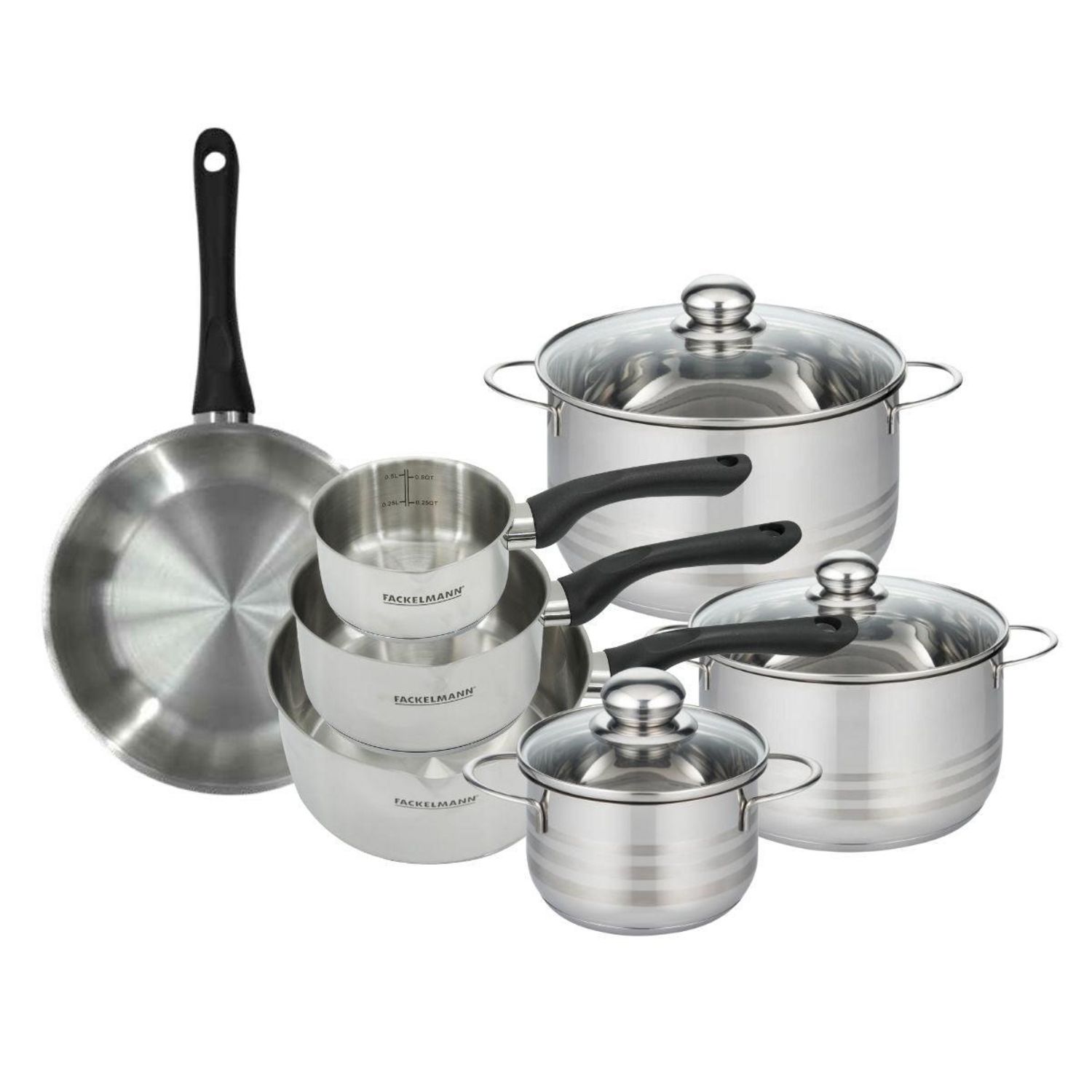 Set de 1 poêle 24 cm, 3 casseroles 12 16 20 cm et 3 faitouts 16, 20 et 24 cm en inox Fackelmann Geneva