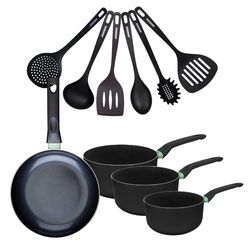 - DESCRIPTION: Batterie Fackelmann Brandao avec 1 poêle de 24 cm, 3 casseroles de 16 à 20 cm en aluminium recyclé avec revêtement céramique antiadhésif, et 6 ustensiles en RPET noir