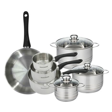 - DESCRIPTION: Batterie de cuisine sans PFAS Fackelmann comprenant une poêle de 28 cm, trois casseroles (12, 16, 20 cm) en acier inox 18/8 et trois faitouts inox (16, 20, 24 cm)