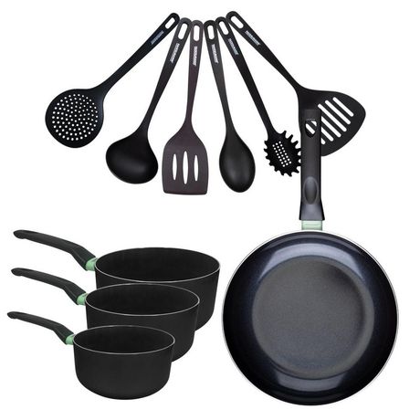 - DESCRIPTION: Batterie Fackelmann Brandao avec 1 poêle de 28 cm, 3 casseroles de 16 à 20 cm en aluminium recyclé avec revêtement céramique antiadhésif, et 6 ustensiles en RPET noir