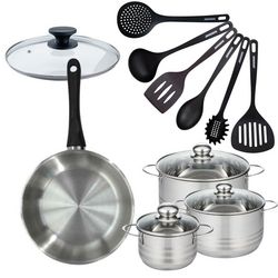 Set de 1 poêle 28 cm en inox, couvercle verre, 3 faitouts inox 16, 20 et 24 cm et 6 ustensiles RPET Fackelmann Geneva