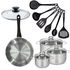 - DESCRIPTION: Set Fackelmann Geneva inox avec 1 poêle 28 cm et son couvercle, 3 faitouts inox de 16, 20 et 24 cm, et 6 ustensiles de cuisine en RPET noir