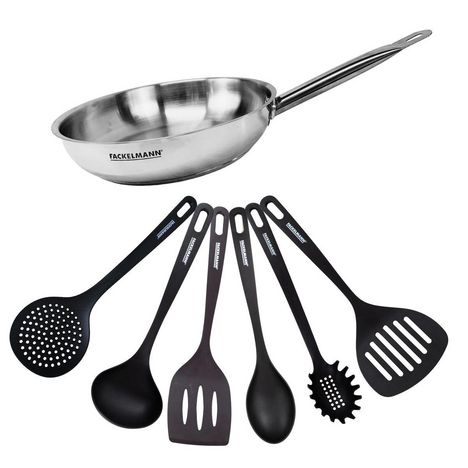 - DESCRIPTION: Ensemble complet Fackelmann Eterna composé d'une poêle inox de 28 cm et de 6 ustensiles en RPET noir pour une expérience culinaire qualitative et pratique