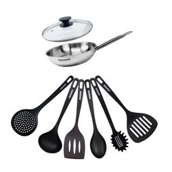 Set de 1 poêle de 20 cm en inox 1 couvercle en verre et 6 ustensiles Fackelmann Eterna