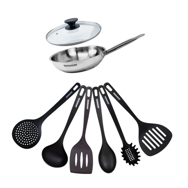 - DESCRIPTION: Set Fackelmann Eterna comprenant une poêle 20 cm en inox 18/8, son couvercle en verre et 6 ustensiles en RPET