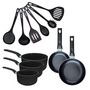 DESCRIPTION: Batterie Fackelmann Brandao avec 2 poêles 16 et 20 cm, 3 casseroles de 16 à 20 cm en aluminium recyclé avec revêtement céramique antiadhésif, et 6 ustensiles en RPET noir