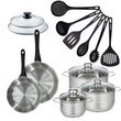 Set de 2 poêles 20 24 cm en inox, couvercles verres, 3 faitouts inox 16, 20 et 24 cm et 6 ustensiles RPET Fackelmann Geneva